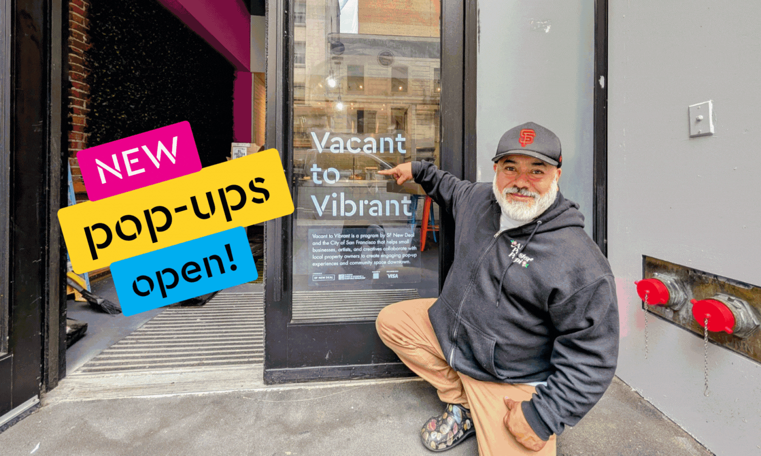 The Latest SF New Deal 9/10/25 SF New Deal 9/10/25 New Pop-Ups and Expansions in Downtown SF Read More Guest User 6/11/25 Guest User 6/11/25 Vacant to Vibrant Welcomes New Pop-Ups: Al Pastor Papi and Craftivity! Read More Guest User 5/23/25 Guest User 5/23/25 Vacant to Vibrant Welcomes Our Latest Pop-Up in Union Square: Nooworks! Read More Guest User 5/5/25 Guest User 5/5/25 New Long-term Leases Signed through Vacant to Vibrant, Bringing Total to 11 as Wells Fargo Expands Program Funding Read More Guest User 4/21/25 Guest User 4/21/25 New Vacant to Vibrant Pop-ups Coming in 2025! Read More Guest User 12/20/24 Guest User 12/20/24 Vacant to Vibrant Welcomes First Pop-Up in Union Square: Oakland Fashion Designer, Taylor Jay Read More SF New Deal 10/21/24 SF New Deal 10/21/24 Vacant to Vibrant Expands to Union Square Read More Guest User 6/18/24 Guest User 6/18/24 Vacant to Vibrant Pop-Ups Open Now! Read More Guest User 5/9/24 Guest User 5/9/24 Vacant to Vibrant Expands this Summer and Wells Fargo Commits $1 Million to Further Program’s Local Impact Read More Guest User 1/19/24 Guest User 1/19/24 Vacant to Vibrant Pop-Ups have Been Extended and Applications Are Open for the New Cohort! Read More Guest User 8/24/23 Guest User 8/24/23 Pop-up Activations Announced for Vacant to Vibrant Program Downtown! Read More